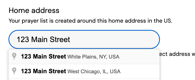 Note: The address lookup system uses a Google Maps API to locate your address and place it on our map. Your prayer list will then be generated based off of that address. In some instances, the system will fail to find the correct address if it is not typed exactly as it appears in Google Maps. For instance, if you provide your address as 123 N Main street, but Google Maps lists it as 123 Main St., you may find it incorrectly placed on your map in Bless Every Home. If the drop-down box does not list your address as you believe it should be listed, go to Google Maps, type in your address and see if their system lists it differently or if it is placed in the correct place. If you are still experiencing an issue locating your address, please submit a help ticket including the address you are trying to use and we will assist you in updating your address.