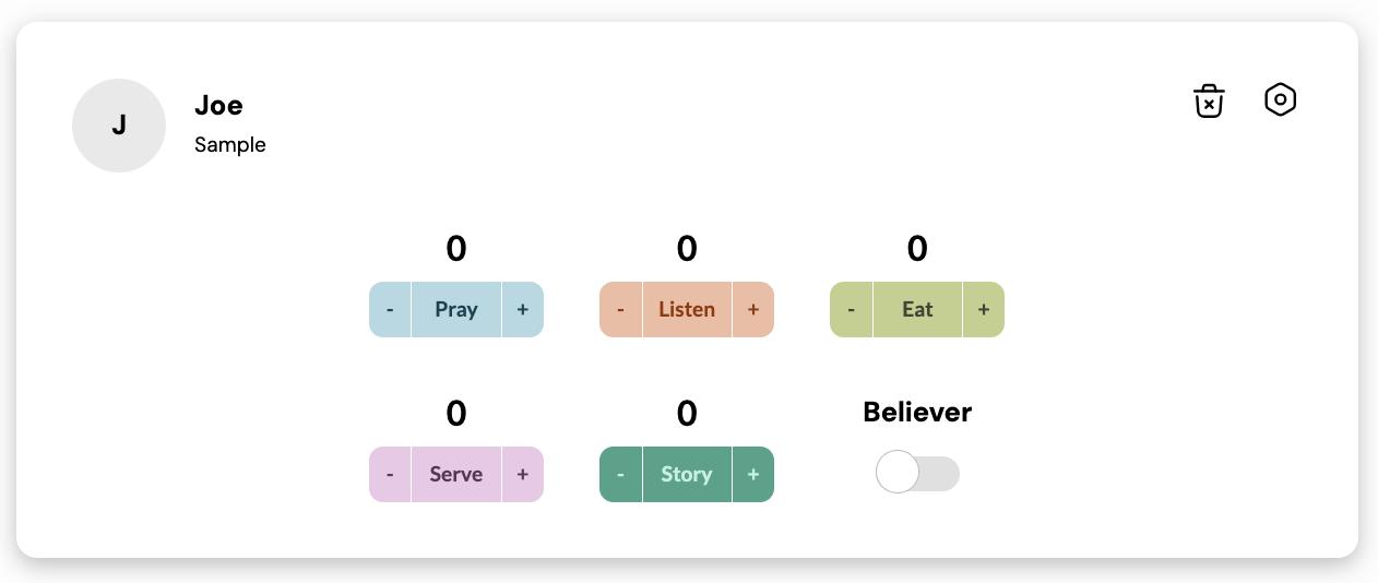 Select the '+' icon for the practice that describes the current status of your relationship with that neighbor. Each time you click on the color icon, it will add one to the total on the corner of that icon. This helps you keep track of how many times you have built your relationship with that neighbor.