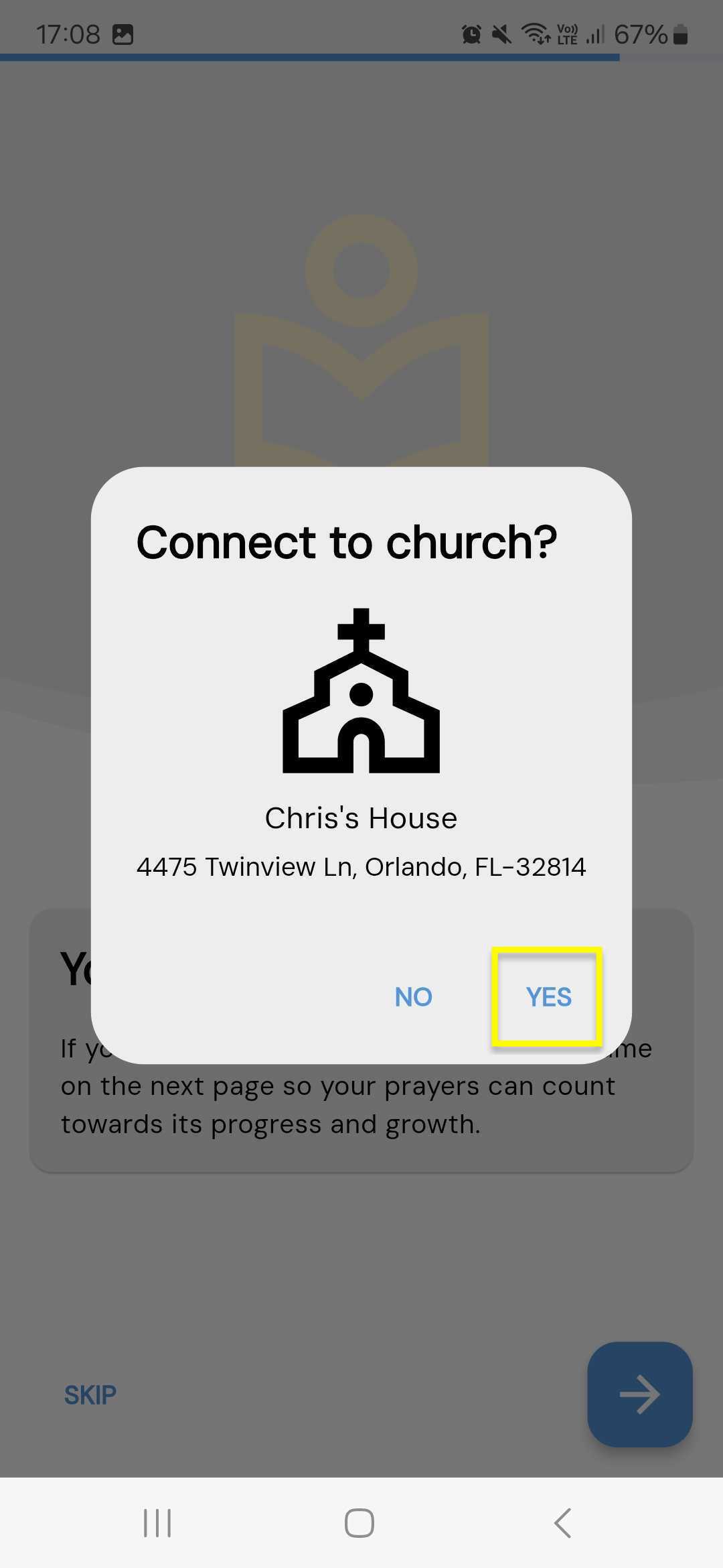 - Once you type in your church it will ask if you would like to 'Connect to your church?' Click 'YES'